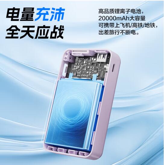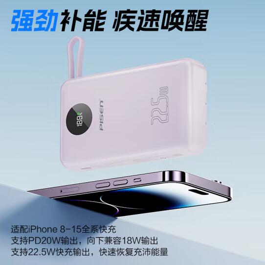 充电宝自带四线22.5W快充小巧便携宿舍移动电源20000毫安大容量可上飞机适用苹果16小米华为P70紫